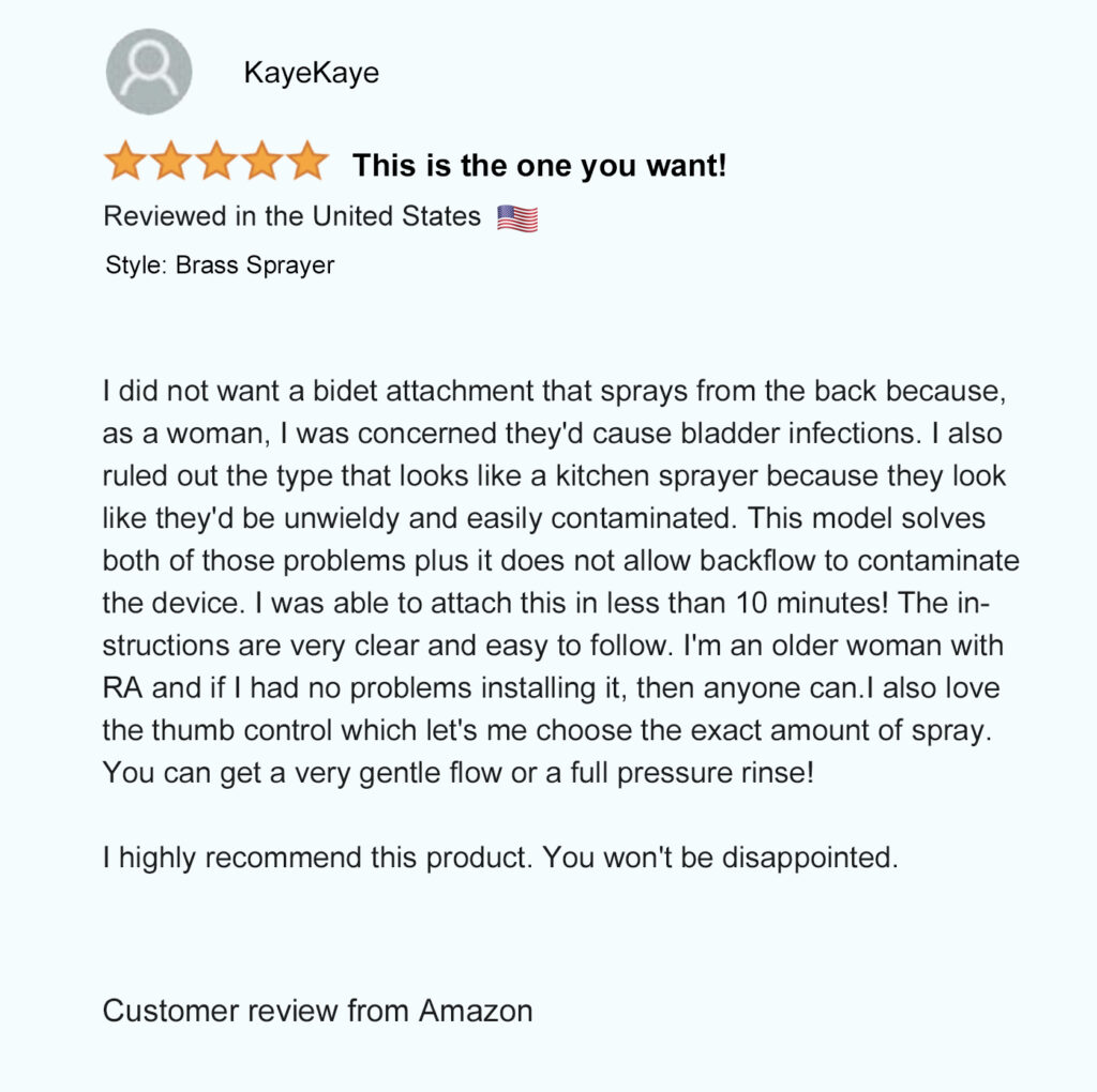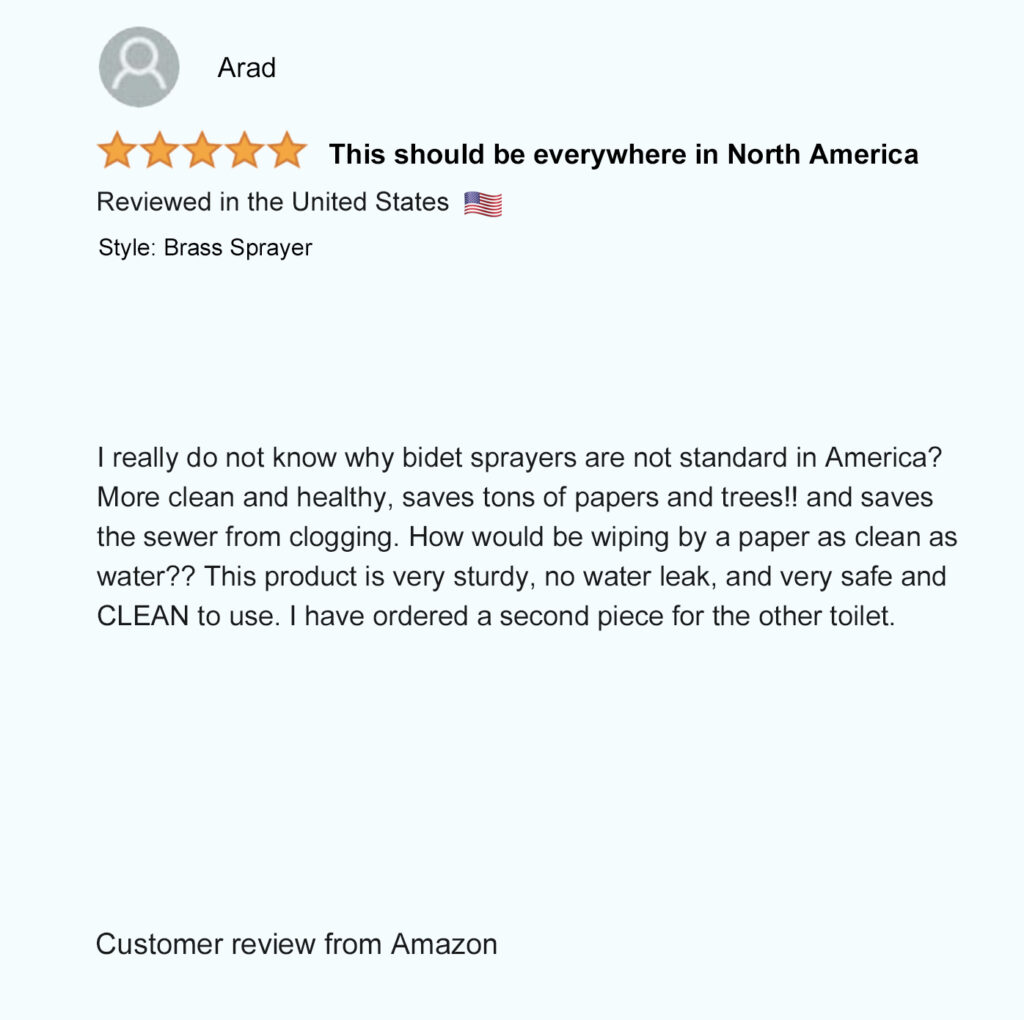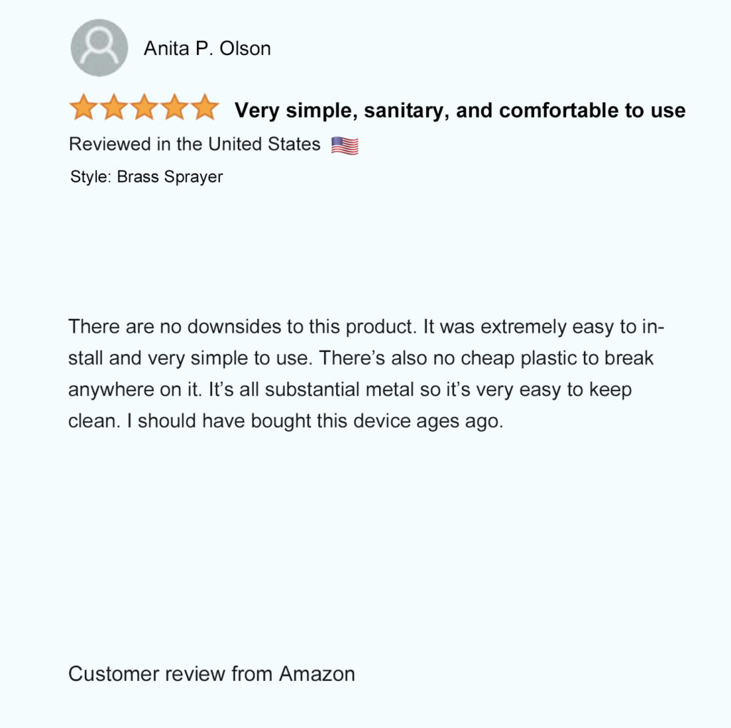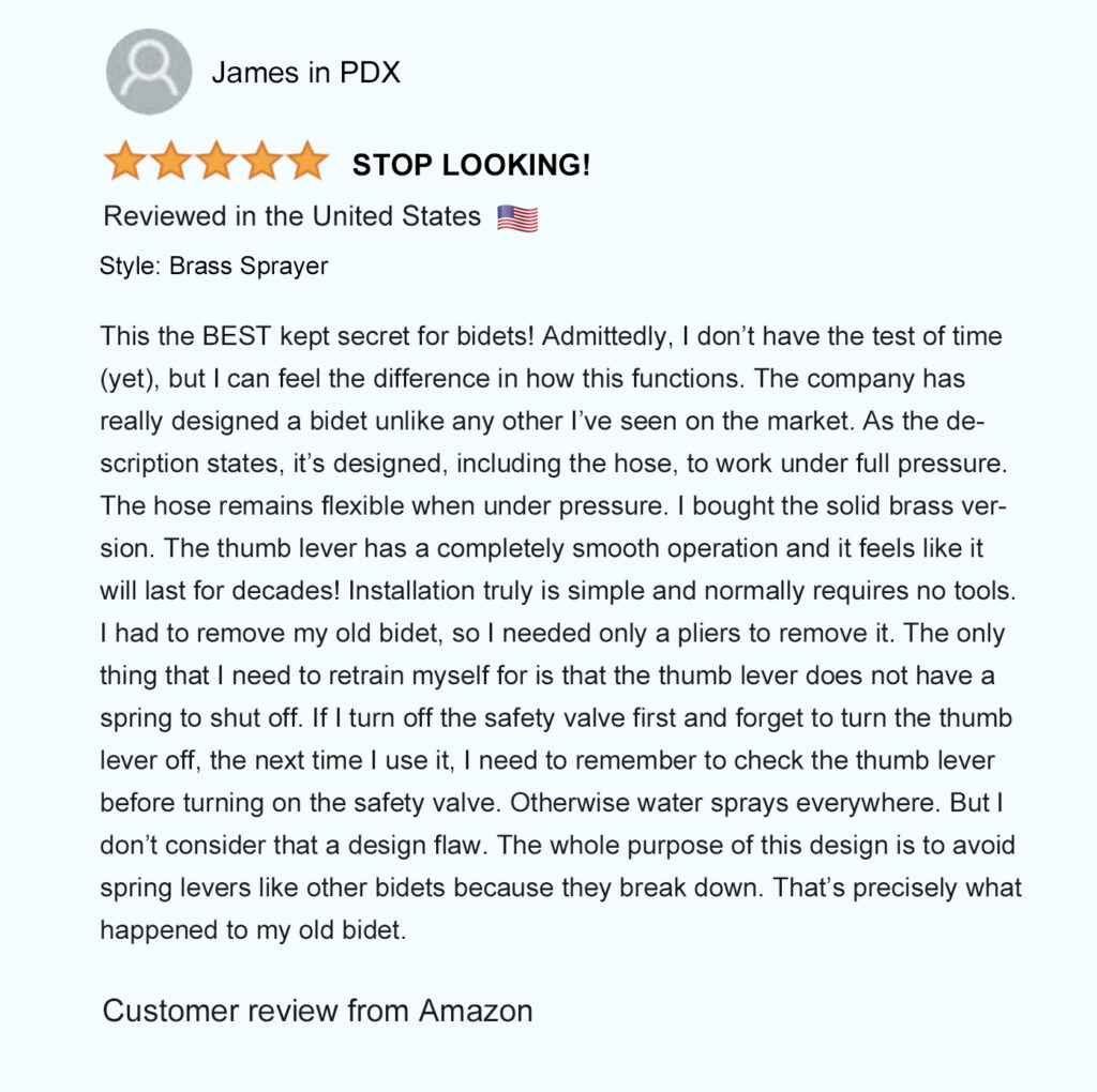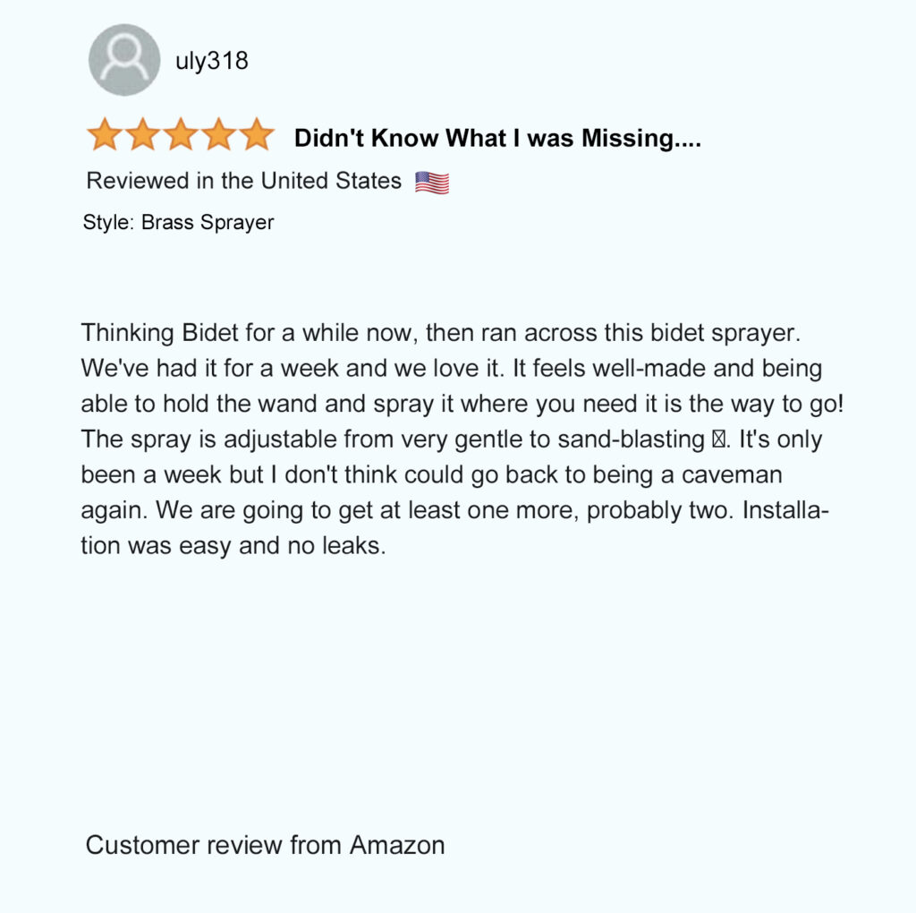 Patented in North America (USA – Mexico – Canada), our unique patented bidet design allows you to comfortably hold the spray wand and control the spray pressure from both sides to easily rinse up and down by simply flipping the sprayer over. Not possible with any other bidet sprayer.