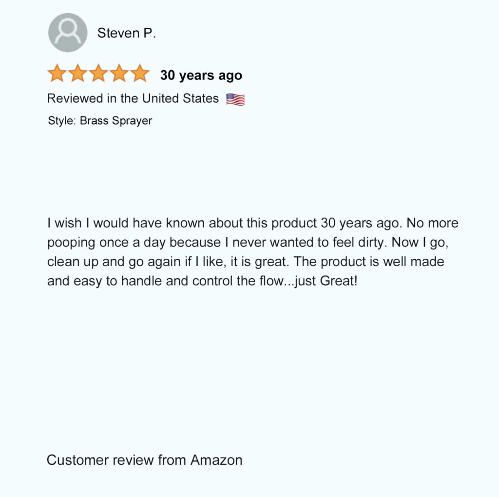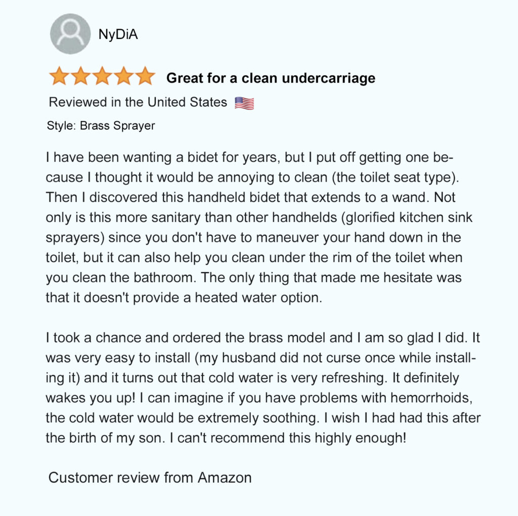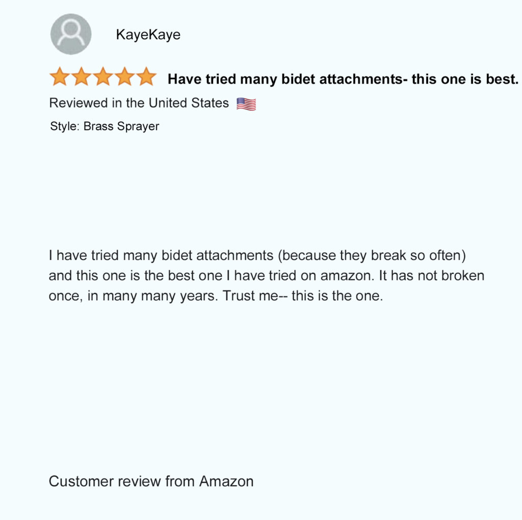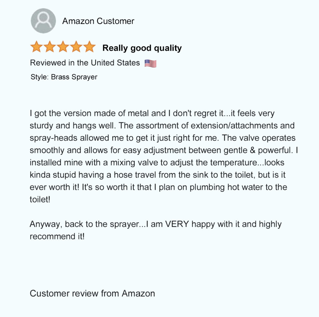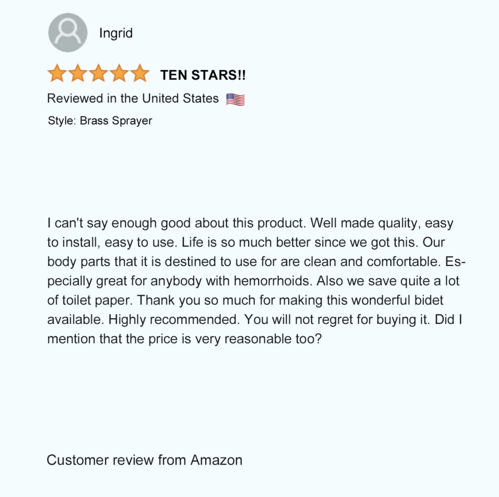 Patented in North America (USA – Mexico – Canada), our unique patented bidet design allows you to comfortably hold the spray wand and control the spray pressure from both sides to easily rinse up and down by simply flipping the sprayer over. Not possible with any other bidet sprayer.