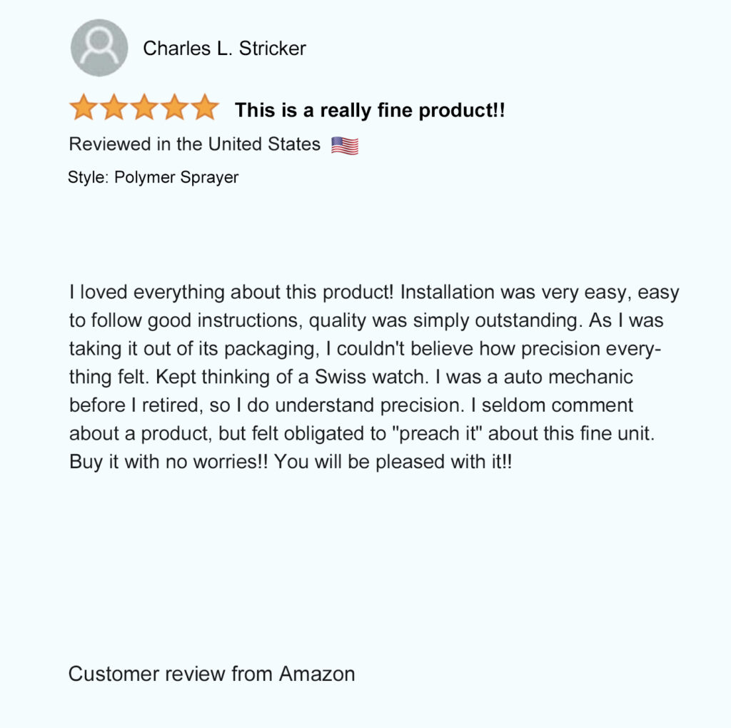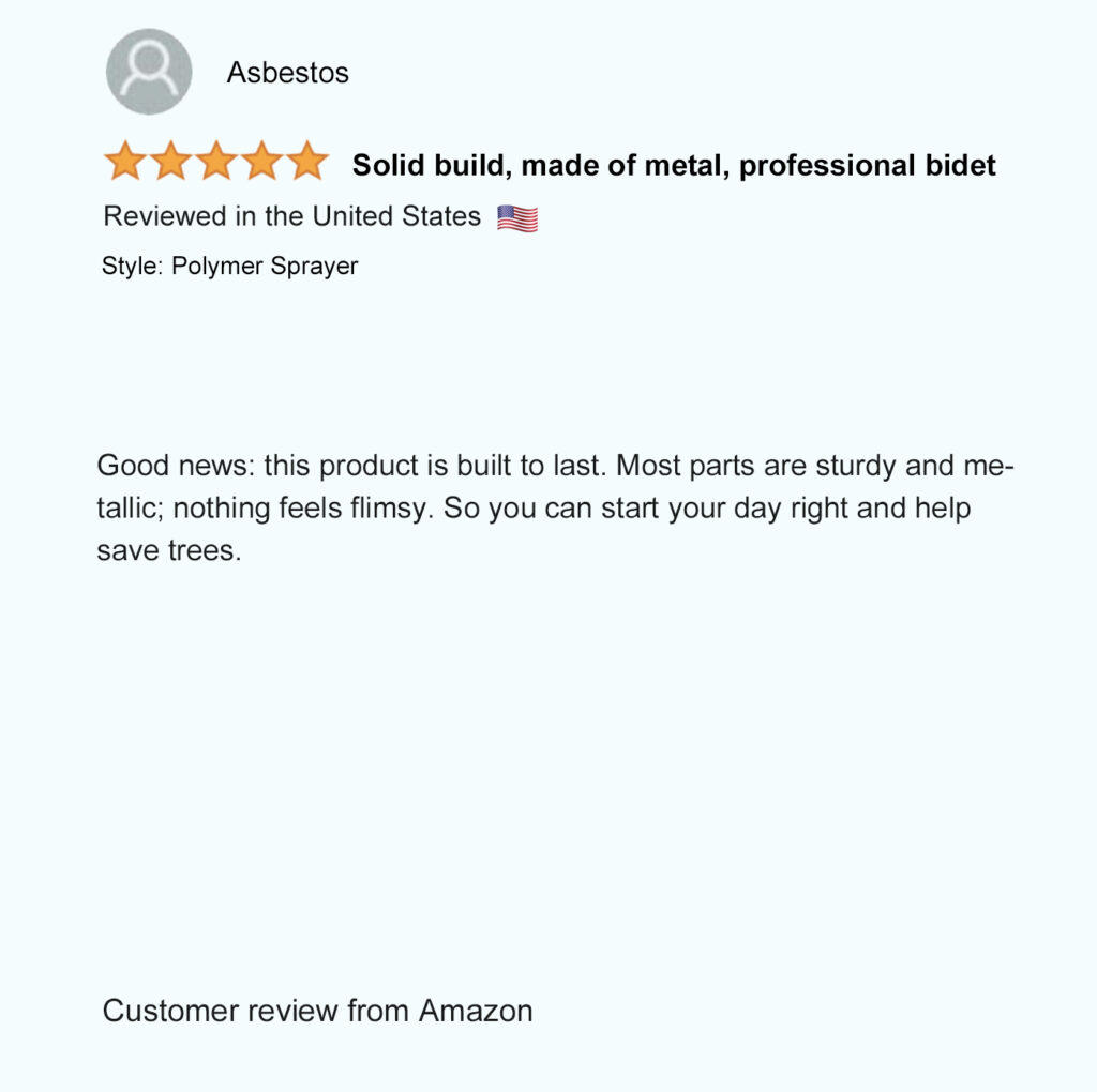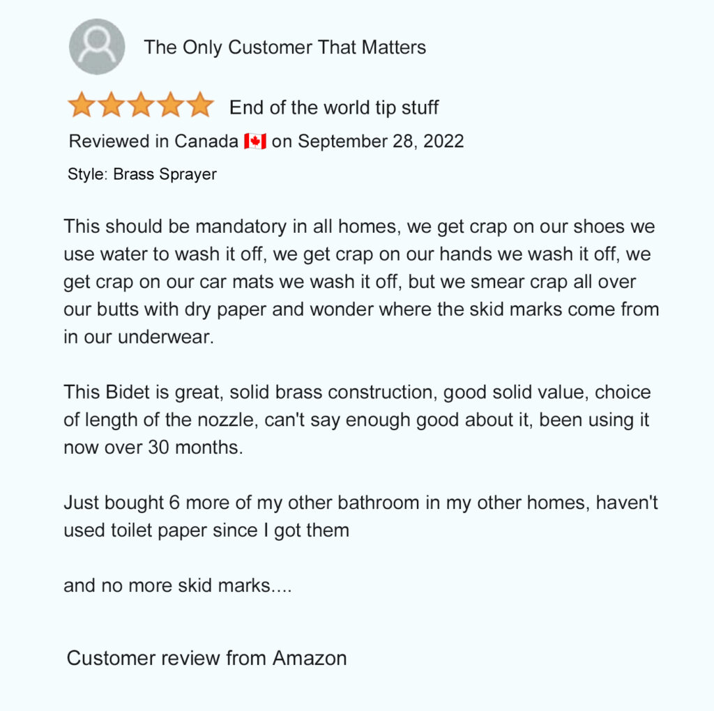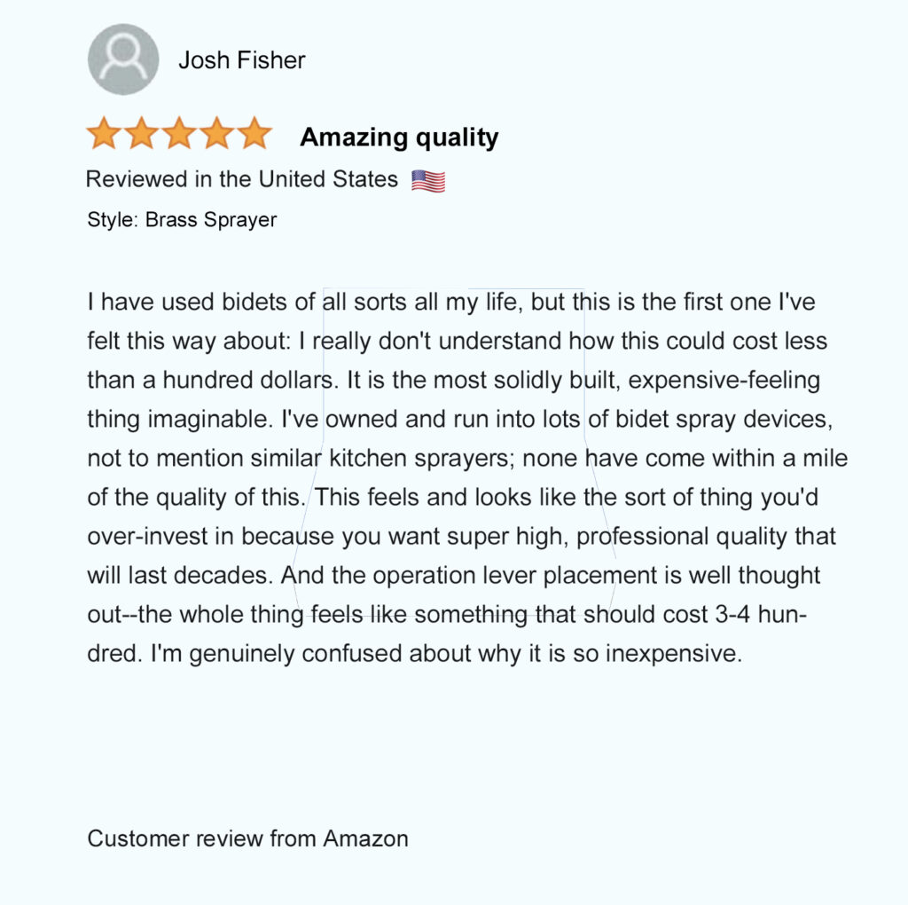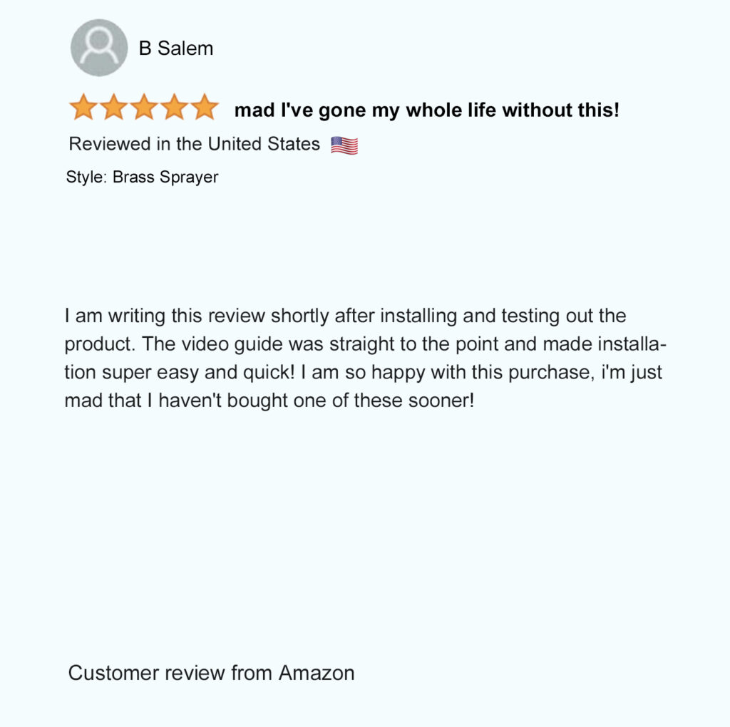 Patented in North America (USA – Mexico – Canada), our unique patented bidet design allows you to comfortably hold the spray wand and control the spray pressure from both sides to easily rinse up and down by simply flipping the sprayer over. Not possible with any other bidet sprayer.