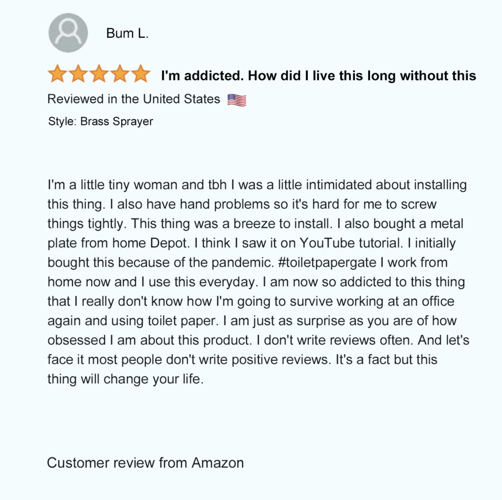 The team here at RinseWorks believes in washing, not wiping because, frankly, Rinsing Works and wiping doesn’t. A new generation of modernized bidet’s are here, with the latest Aquaus 360 Premium Handheld Bidet by RinseWorks. The Aquaus 360 simply replaces the old, “antiquated” and ineffective seat attachment type bidets currently sold on the market and completely leaves the gross process of wiping and smearing with toilet paper in the past – where it belongs.