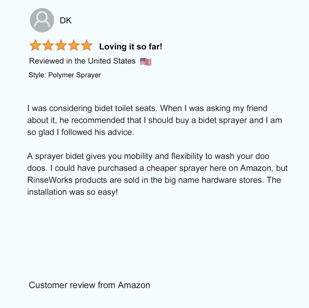 If you are not completely satisfied with the performance of your RinseWorks bidet products for any reason, you can return them within 30 days from the date of purchase with a receipt for a full refund – no questions asked.