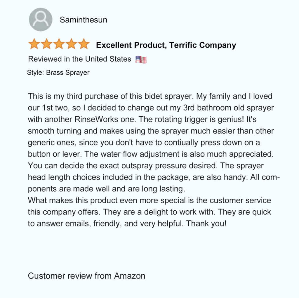 RinseWorks is an American company with over 25 years of experience in designing and manufacturing handheld bidets and specialty plumbing parts.